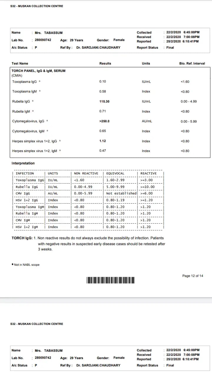 Hello .. I m Tabassum from Kanpur.Mera 1 miscarriage hochuka hy... Now I m 16 weeks pregnant. Mera torch test report add ki hy. Can anyone help me . Describe . Kisi k sath aisa case hy. 5th week me fetus k sath small sa clot tha . To injections thi with medicine. That problem solved . In week 18 Dr ne 2nd level ultrasound Hona hy with quadruple blood test ..I m very tensed .. plz feedback. And pray for me.